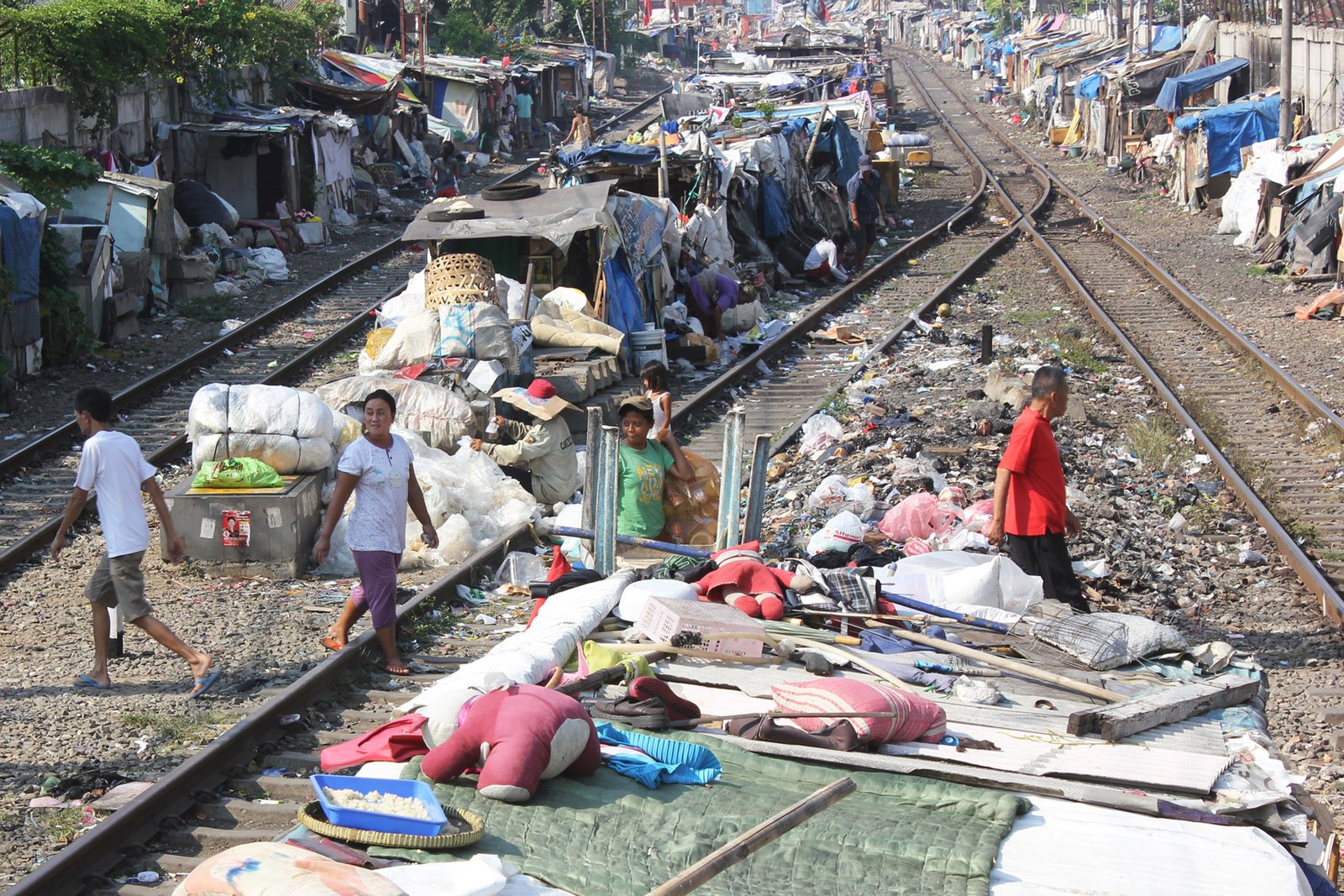 Sejumlah warga beraktifitas di kawasan kumuh pinggir rel kereta api Stasiun Senen, Jakarta, Rabu (2/7).