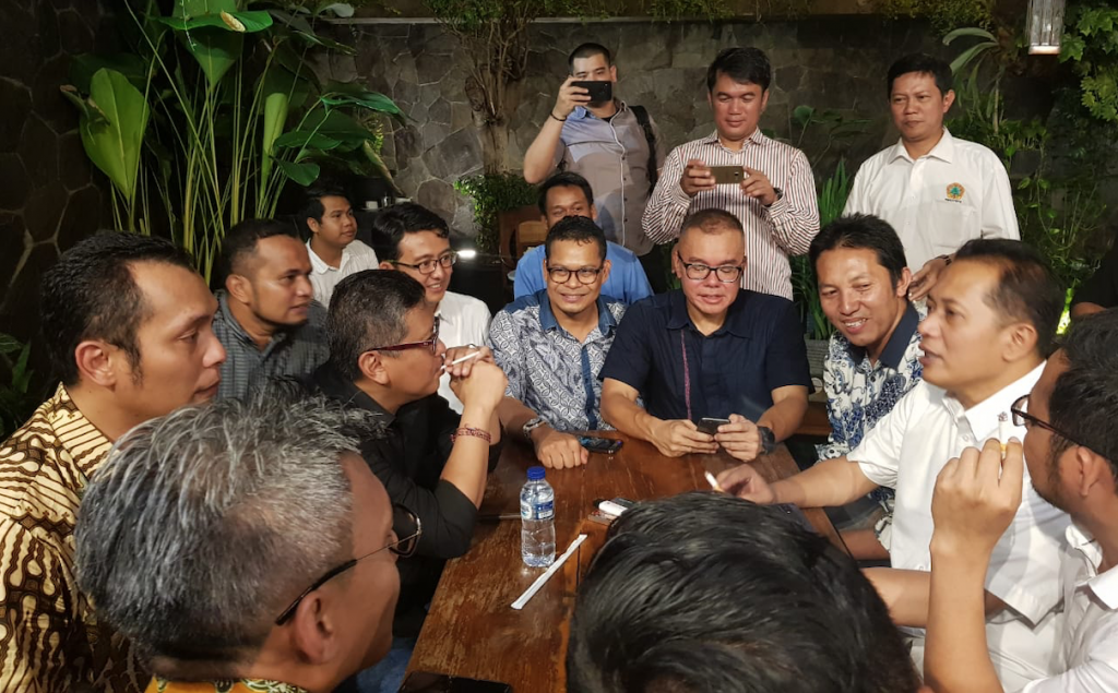 Indra J. Piliang, politisi Partai Golkar yang mengusung Jokowi-Maruf, nampak tengah menikmati momen kebersamaannya dengan beberapa politisi dari partai pendukung Prabowo-Sandi. Melalui akun twitternya @IndraJPiliang membagikan foto di mana mereka sedang tertawa dan asyik nyebats atau merokok bareng.